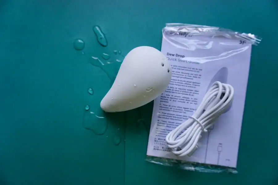 Satisfyer Dew Drop je majhen klitoralni vibrator, ki naj bi bil primeren za začetnike. Ko sem prebrala ta podatek, sem se malo spačila, saj se imam po vseh teh letih že za bolj zahtevnega uporabnika. Kljub temu je ta podatek iz glave pregnala oblika kapljice, oblečene v mehek dvojni beli silikon. Bela barva je v moji omari redka, zato sem je bila toliko bolj vesela. Če vedno umažem vse bele majice, je bila umazanija na tej igrači celo dobrodošla.