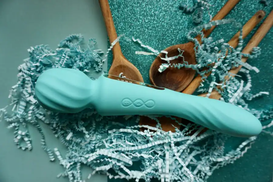 Glavna zvezda te embalaže pa je bila zagotovo masažna palica Switch. Obdana je bila s turkiznim silikonom, ob straneh pa sta jo krasili dve zlati ploščici iz ABS plastike. Na sredini so gumbi za upravljanje vibracij, zgornji “plus” za zviševanje moči, spodnji “minus” za zniževanje in srednji za prehajanje med programi. V teh lastnostih je zelo podobna, če ne celo identična drugim Lelovim igračam, a tisto, kar jo dela posebno, je obojestranska uporaba. Na vrhu počiva masažna glava za zunanjo stimulacijo – lahko je to ščegetavček, zadnjična odprtina, ali pa razbija mišične vozle in blaži bolečine v žolčniku. Drugi del igrače je namenjen stimulaciji vseh točk, ki jih najdene v temnih globinah breskvice. Silikon obeh delov je valovit, kar naj bi pripomoglo k dodatnemu užitku.