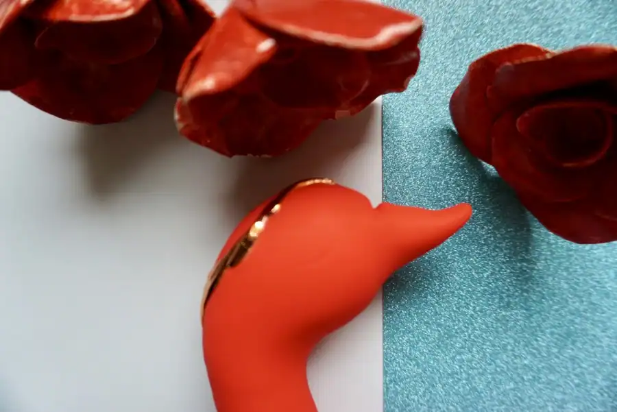 Začetek je bil že obetaven. Čeprav je igrača nekoliko dlje čakala v omari zaradi razlogov, ki so omenjeni v prejšnjem članku, je bilo popoldne po dopoldanskem filmskem zajtrku v Ljubljani in kuhanju jedi Coq Au Vin (Petelin v vinu), kar idealen čas, da iz omare po popoldanskem počitku potegnem še drugo ptico. Tokrat labod ni bil klasično bel, temveč oblečen v divje rdeč silikon, na glavi pa je nosil bronasto krono, žal iz ABS plastike in neprave žlahtne kovine. Znotraj krone se skrivata dva gumba za upravljanje igrače – zgornji za vklop in upravljanje vstavljivega dela, spodnji za nadzor glave, na kateri počiva kljun, ki masira ščegetavček. Nad krono ležita dve “pikici” za magnetni polnilni kabel. Swana ne ponuja zgolj oblike laboda, vendar je skrbno oblikovana. Na njej boste lahko poleg kljuna opazili še oči in pernati detajl vstavljivega dela.